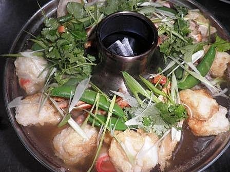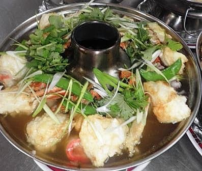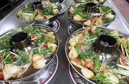 這個火鍋用活螃蟹現蒸後,再放入火鍋內圍為成一圈。